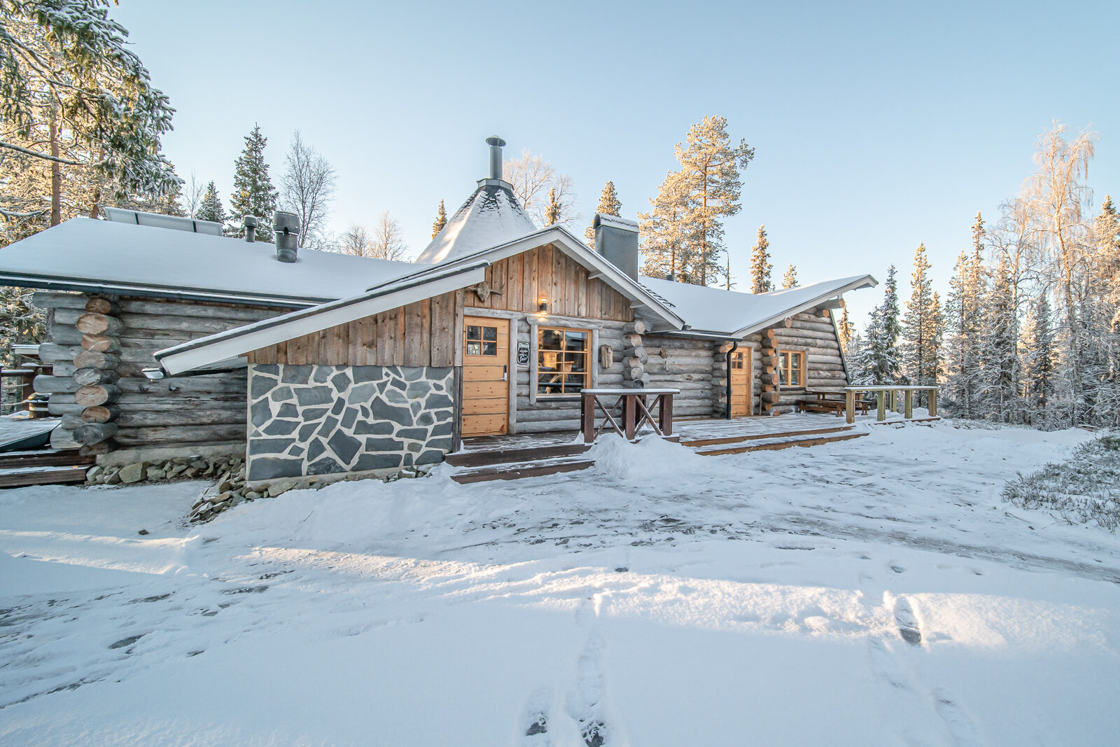 Lapland Lodge tarjoaa upeat puitteet: Perinteinen puusauna ja ulkoporeallas ovat paikkoja rentoutumiseen, kiireettömyyteen sekä kehon ja mielen hyvinvointiin.